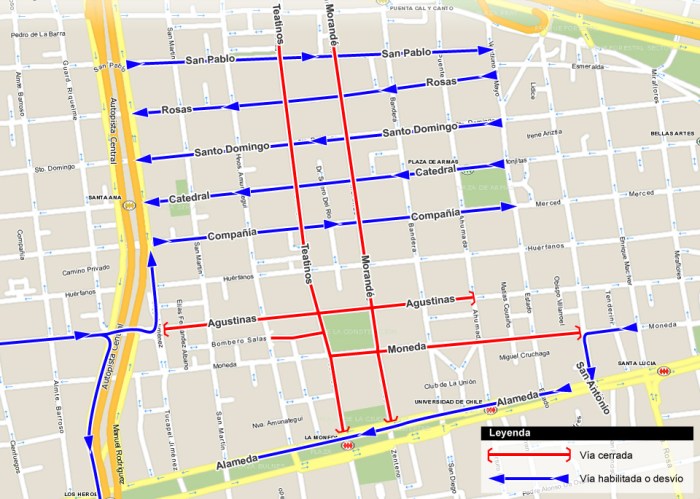 El tránsito alrededor del Palacio de La Moneda también será modificado para el desplazamiento del presidente. Aquí el criterio es escoger el mínimo tiempo de recorrido, el más rápido. Mientras menos tiempo se esté en la calle, más seguro uno estará.