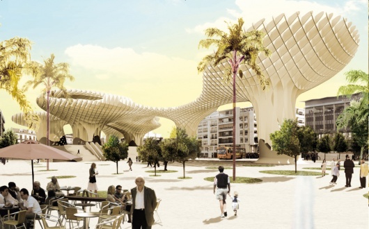 El proyecto Metropol Parasol -2004-, ubicado en Sevilla, del arquitecto alemán Jürgen Mayer se enmarca dentro de estas características. Un gran parasol, que protege una plaza, originalmente de hormigón y acero cubre un área de aproximadamente unos 10.500 m2. Albergando en sus subterráneos un museo arqueológico, re-ubicando el mercado de abastos que desde hace más de 30 años ocupa de manera “provisional” un rincón de esta céntrica zona de la ciudad de Sevilla.
