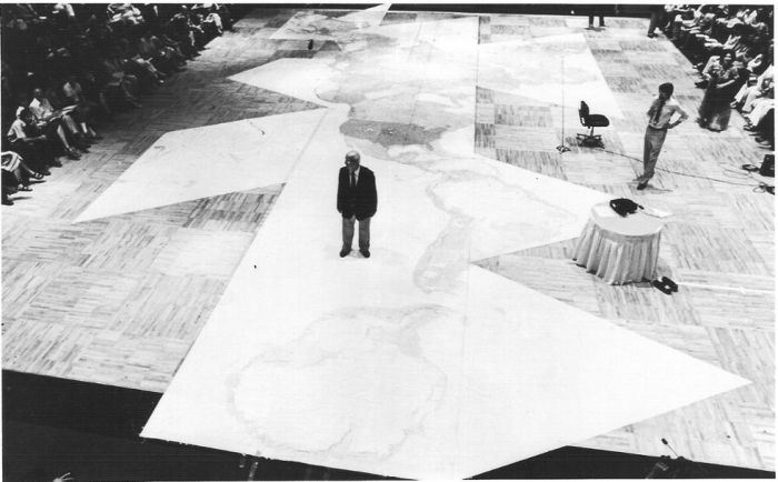 La dislocación de los centros habla de una tras-territoriedad, de una movilidad que exige nuevas formas de leer el terreno sobre el cual se transita. Y esto implica nuevas formas de representar los territorios culturales. Tal como el mapa de América publicado por el colectivo Amereida en los sesenta, deudor de “Sur, nuestro norte” de J. T. Garcia con su famosa América invertida, o el mapa Dimaxion de Buckminster Fuller, en donde una lectura del territorio va asociada a una nueva manera de pensarlo. Se necesitan unas maneras de pensar, leer e imaginar un territorio que rompan con las lecturas coloniales. Unas lecturas que hablen de una vocación por la movilidad, la simultaneidad, por la ocupación de posiciones que se saben transitorias. Una capacidad que al igual que Moby Dick, permita estar en todas partes haciendo de lo eventual su fortaleza.