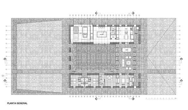 Una estricta grilla – derivada de la modulación de los fardos de paja que constituyen el muro perimetral – impone el orden de la planta, desplazando el patio. Una “centralidad desplazada” en donde el patio aparece como un espacio híbrido, a medio camino entre jardín seco y habitación.
