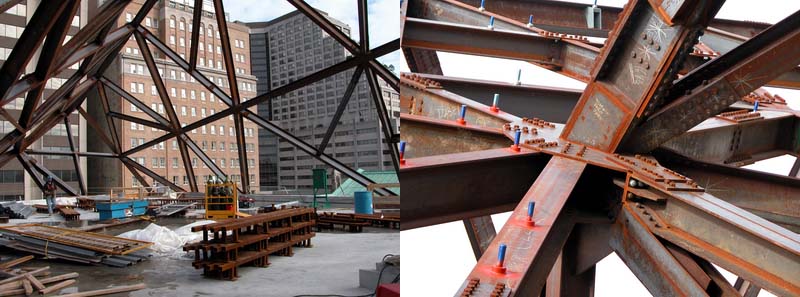 Designed to serve the main entrance to the Royal Ontario Museum, the Lee-Chin Crystal comprises five coated prisms in a ratio of 25% and 75% glass in anodized aluminum. An enclosure that is supported by a steel structure with similar characteristics to that used in the DAM.