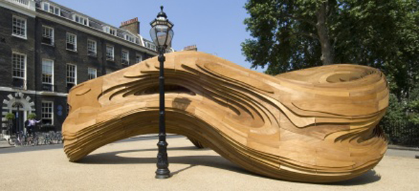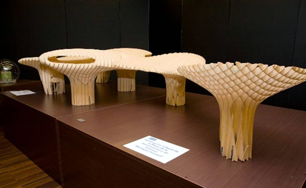 El proyecto – si bien terminó construyéndose en Kerto® – en un comienzo estuvo pensado en acero. De esto dan cuenta las imágenes presentadas por el equipo de Mayer al concurso, en donde los parasoles aparecen construidos a partir de una delicada filigrana metálica. Un elemento el cual deja pasar no sólo una luz tamizada, sino que además permite el surgimiento de vistas parciales del entorno inmediato a la plaza. Sin embargo, la posibilidad de construir el proyecto siguiendo el diseño generado por los arquitectos, pronto fue desechado, probando ser demasiado costoso. Es así como el equipo de arquitectos – en colaboración con el despacho de ingeniería Ove Arup – desarrollaron otras alternativas, llegando finalmente a la que apareció como la más plausible: una estructura tridimensional de Kerto® apoyada sobre una sub-estructura de hormigón y acero.