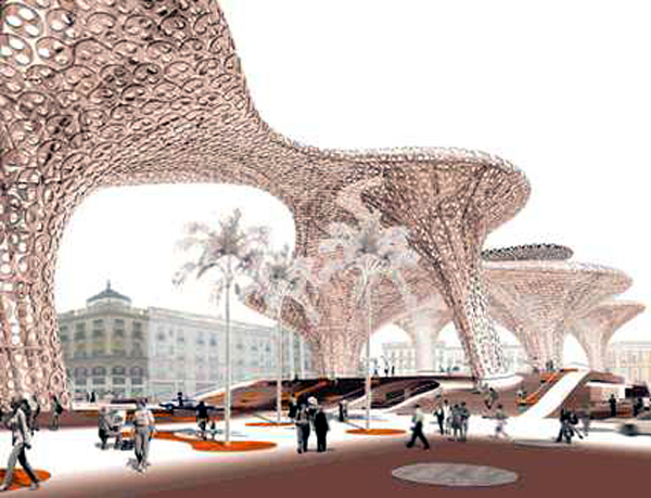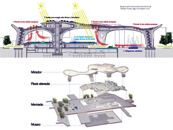 La propuesta de Mayer se organiza por medio de cuatro niveles, siendo su principal característica, la presencia de seis parasoles de doble-curvatura. Estos elementos están construidos mediante una doble trama estructural de Kerto®, y sus alturas oscilan entre los 20 y 26 metrosde altura, superando así el horizonte fijado por las cornisas de los edificios adyacentes a la Plaza de la Encarnación.