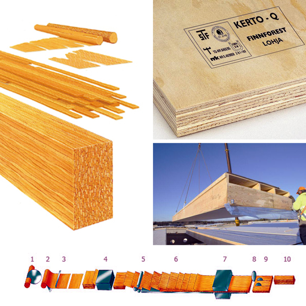 Las chapas una vez cortadas son secadas al horno. Después del secado es que las chapas se encolan, empleando un tipo de pegamento no tóxico y resistente al agua (Kerto-Q LVL). Las chapas una vez pegadas entre sí, son apiladas para posteriormente ser prensadas en caliente. Luego se dimensionan, se dividen en pilas, para finalmente ser almacenadas.
