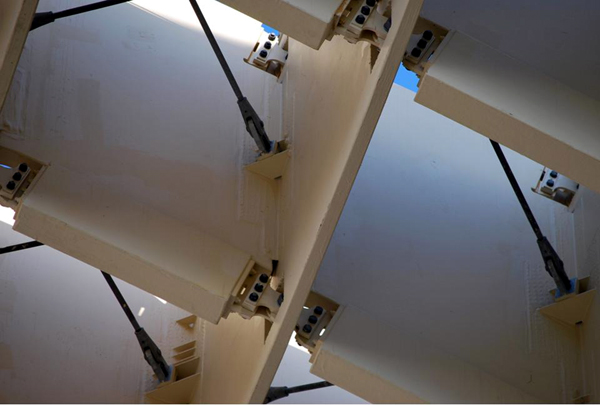Este es un punto importante que distingue a la estructura del Metropol-Parasol. Si bien están construidas a partir de un super-material como es el Kerto®, la super-fragmentación de los componentes de la estructura, hace que esta esté formada por elementos discontinuos. Hecho que hace que gran parte de los esfuerzos de cizalle sean absorbidos por los conectores de acero. Por otra parte, la escasa longitud de los elementos de madera y su poca continuidad, hacen que el Kerto® tenga un comportamiento muy débil ante la flexión – una característica por lo demás fundamental en la madera – por lo cual estos esfuerzos son absorbidos mediante tensores de acero, incrementando así el peso total de la estructura.