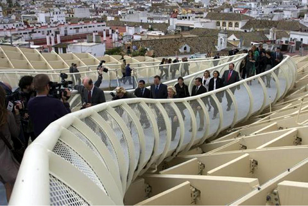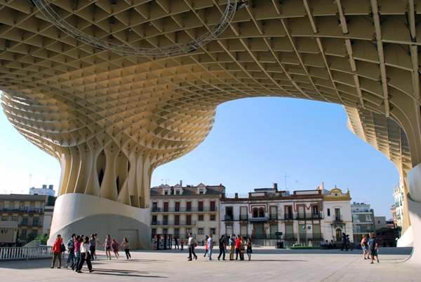 Conocido popularmente como “las setas de la Encarnación”, el Metropol-Parasol se levanta sobre el nuevo museo arqueológico de la ciudad, el cual exhibe importantes piezas de Sevilla en su época romana. Sobre este basamento histórico, es que se yerguen seis estructuras o “parasoles” que dan forma a una pérgola de 160 metros de largo, 80 metros de ancho y30 metros de alto. En cuya cúspide – donde los parasoles se conectan – se emplaza una terraza en donde se ubican un restaurante y una pasarela, desde la cual se tienen vistas panorámicas de toda la ciudad.