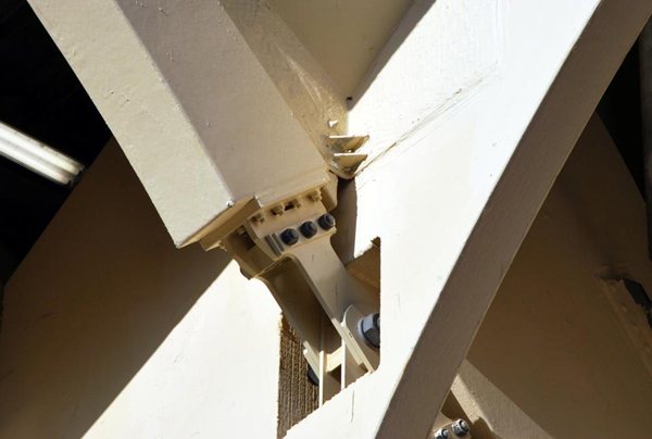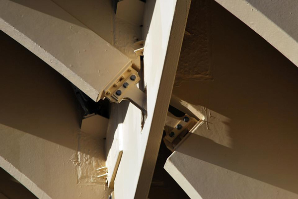 Tomando en consideración las fuertes solicitaciones a las que está sometida la estructura – especialmente en aquellas zonas en volado – es que se empleo una estructura híbrida a través de la cual los esfuerzos a compresión de la madera son combinados con elementos de acero que actúan a tracción.