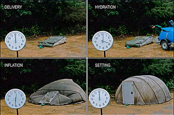 Developed over 10 years, the «Concrete Canvas Shelter» (www.concretecanvas.co.uk ) is a shelter designed to provide a safe environment in the early hours following a disaster. Constructed from a fabric with hydraulic properties – which forge 24 hours after wetting – the «Concrete Canvas Shelter» (CCS) needs only two people for installation. After removed from its packaging, the CCS is inflated to take the form of a tent. Later on its outer face wet with water of any kind, be it drinking contaminated or sea. After 24 hours, the fabric acquires resistance and impermeability of the concrete itself, making CCS a haven of excellent characteristics for harsh environments.