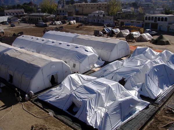 The first time that MSF was first used inflatable hospital, was in November 2005 to mark the Pakistan earthquake (http://blip.tv/msfuk/tentes-gonflables-3105168 ). MSF occasion where installed in the town of Mansehra hospital of 1000 square meters, can accommodate 120 beds by nine inflatable tents. The structure was further provided with four operating rooms, emergency room and intensive care unit facilities, which address some 700 victims of the earthquake. Since that time, MSF has continued to use this type of solution for field work: Indonesia and southern Sudan in 2006, Yemen and the Democratic Republic of Congo in 2008, and Gaza, and Sri Lanka in 2009, have been some scenarios where hospitals have served inflatable.