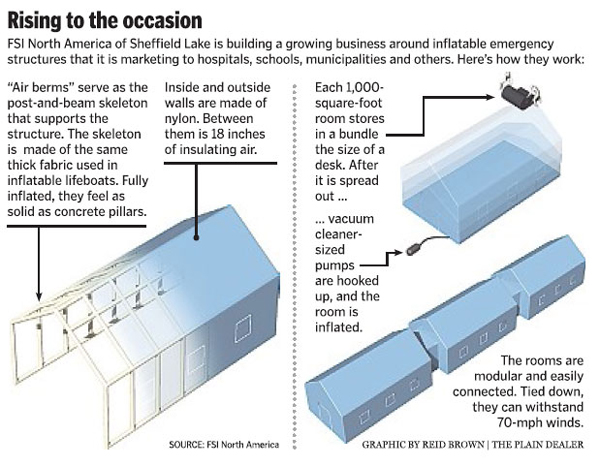 It is this situation that the NGO Medecins sans Frontieres (www.msf.org ) has faced many times. That is why for nearly six years has been developing a type of inflatable hospitals that can be enabled as soon as 48 hours. These units – which are shaped like huge tents – a surface of about 100 square meters. Air circulates within the tubes inside the walls and roof of the tent, pressure becomes stable the entire structure, which can withstand winds of up to 100 kilometers per hour. These tubes are constructed with the same fabric used to construct inflatable boats, which ensures both its resistance to air pressure, and tightness. On this structure of pillars and beams installed inflatable nylon membrane, which serves as a finish for walls and roofs. The thickness of these walls once completed is 0.46 meters. The basic module can hold inside two operating rooms and post-operative room of 12 beds. Each unit has its own decontamination area, which ensures the necessary sterile conditions.