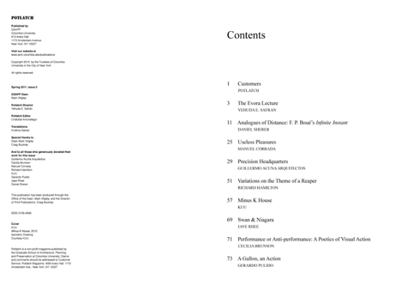 Cristóbal Amunátegui. El proyecto surge de algunas colaboraciones anteriores con un profesor del máster en arquitectura de Columbia, Yehuda Safran. El fue mi profesor en algunos cursos de este programa que hice entre mayo de 2008 y mayo de 2010, y hacia el final de ese período fui su ayudante de taller. Y a partir de un montón de conversaciones surgió la idea de hacer esta publicación, por distintas cuestiones, partiendo por el nombre de la revista. El nombre hace un puente con el de la publicación que tenía la Internacional Letrista cuando ya Debord estaba incluido en el grupo, me parece que entre el 54 y el 57 aproximadamente. Una publicación que se repartía gratuitamente entre conocidos, y cuyas contribuciones se hacían también gratuitamente. La Potlatch letrista tenía por supuesto que ver con el espíritu del potlach, que es este sistema ancestral de intercambio de regalos. En el fondo un modo de economía basado no en el dinero, sino en el intercambio de regalos. Y claro, justo en esa época se produjo el derrumbe de Wall Street en Nueva York, y los EEUU entraron en una caída violenta de la economía, con los consiguientes rescates del gobierno, etc. Entonces a partir de ese momento comenzamos a pensar que la naturaleza de la arquitectura, de su ejercicio profesional y su pensamiento intelectual, tiene que ver mucho menos con un objeto de consumo que con un oficio donde lo que tu hagas, tiene el potencial de convertirse en un regalo que tu intercambias con alguien, con una comunidad determinada por ejemplo. Porque de todos modos existe una cierta asimetría entre lo que recibes económicamente por tu trabajo, y todo el compromiso y expectativas que asumes con una obra, que muchas veces puede ser irracional. Entonces, incluso más que un intercambio, el trabajo del arquitecto deviene por momentos en una especie de regalo total, como diría Bataille. Ese es a grandes rasgos el punto de partida de esta publicación, y lo que definiría la selección de sus articulos y proyectos, donde lo “gratuito” aparece siempre de modo más o menos explícito. Lo que hicimos después fue ir a ver a Mark Wigley, el decano de la GSAPP (Graduate School of Architecture, Planning and Preservation) de Columbia, a conversar a cerca del proyecto. Él tiene esa política bastante libremercadista de apoyar todas las iniciativas donde reconozca un potencial determinado, pero solo hasta el punto en que se sostengan solas, y se prueben exitosas. Te dice: “Yo apoyo mientras dure; si decae, se acaba el financiamiento y muere sola.” Y justamente ese financiamiento nos permite trabajar tranquilos y no perder tiempo saliendo a buscar plata en otros sitios. Son dos números al año, y ahora estamos por lanzar el segundo en septiembre.