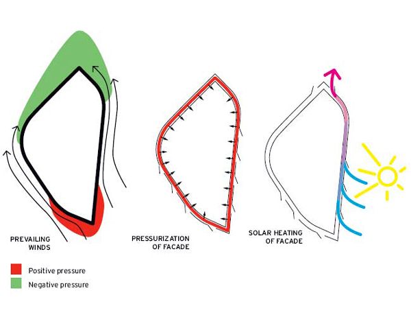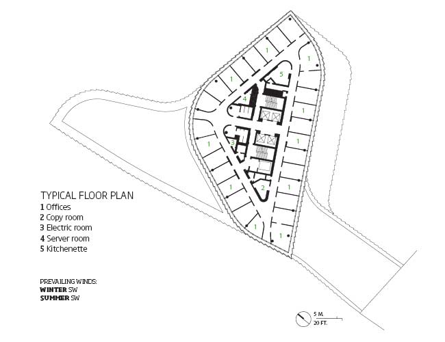 “Se considera completamente normal el vivir en espacios con aire acondicionado. En este edificio financiero las personas también esperan tener aire acondicionado. Pero es aquí donde nosotros apostamos por una alternativa de espacios naturalmente ventilados. Sabíamos que esto la gente lo tomaría como una carencia, algo proveniente del pasado. Para convencerlos de lo contrario – de que es un lujo, un lujo que es además un adelanto – tomó diseño inteligente y habilidad. La arquitectura juega un rol en dar al menos la oportunidad para realizar un cambio en los modos de vida, que se volverán inevitables si es que las predicciones a las que nos enfrentamos están en lo correcto. Si se lleva esto a términos simples, significa que la gente deberá consumir menos. El campo propio de la arquitectura – espacio, materiales, la manera en que están hechas las cosas – pueden actuar como una compensación para lo que es percibido como una pérdida de confort”