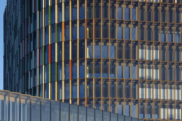 Y es que la fachada en el edificio de la KFW Westardake tiene un rol protagónico. Este es el lugar de los intercambios entre la atmósfera interior y exterior. La planta se encuentra circunscrita por un anillo que da forma a la fachada. Una serie de “flaps” o esclusas – en la forma de dientes de sierra – se disponen a través del perímetro de la fachada. Es por estas esclusas – que los arquitectos han tratado con diferentes colores – es por donde se produce el intercambio de aire con el exterior. La presurización de este espacio (de 71 cms en su ancho mayor) permite la apertura de ventanas sin la generación de los molestos efectos generados por las diferencias de presión a lo largo de la superficie del edificio, así como las pérdidas de calor o ganancias de aire caliente a través de estas cuando se requiera. Las escotillas a su vez son controladas por una estación meteorológica instalada en la cubierta del edificio que regula las aperturas y oclusiones de las escotillas. Este sistema de autorregulación es el que permite un comportamiento al interior del edificio “de ventanas abiertas”, que recibe además el apoyo de un sistema de ventilación mecánica activado cuando la temperatura es menor a los 10°C y superior a los 22°C.