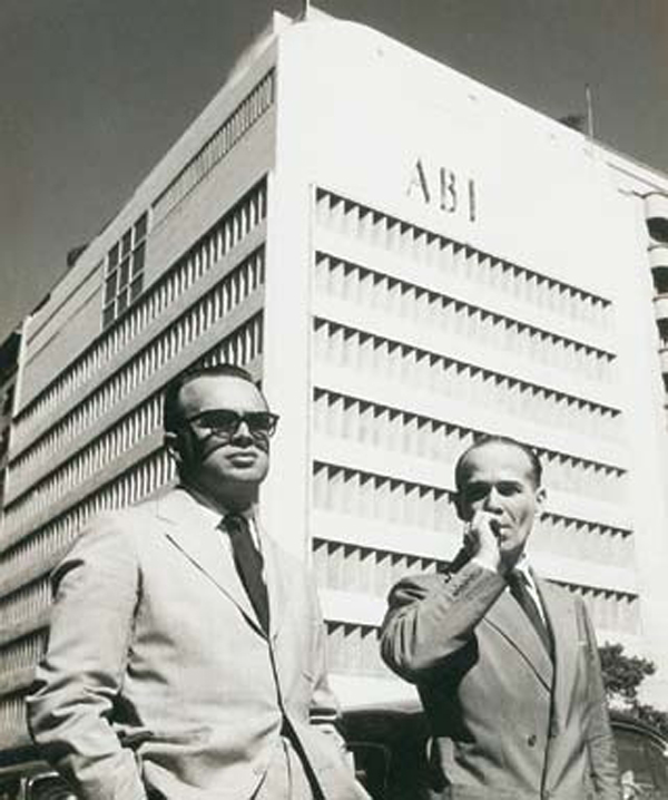 Los arquitectos Marcelo y Milton Roberto frente al edificio de la Asociación Brasilera de Prensa (ABI). Río de Janeiro, 1938.